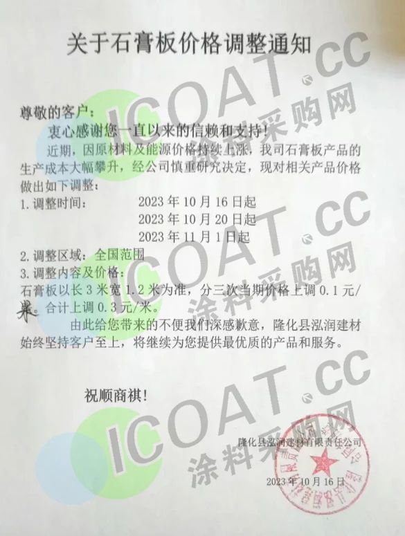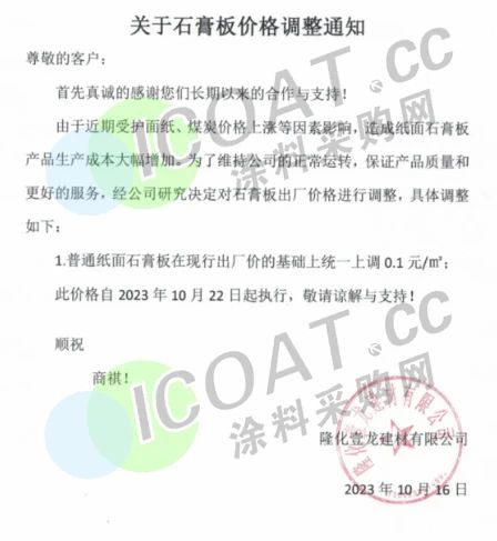 隆化壹龍建材宣布,10月22日起,普通紙面石膏板在現行基礎上統一上調0.1元/㎡。