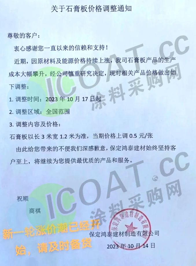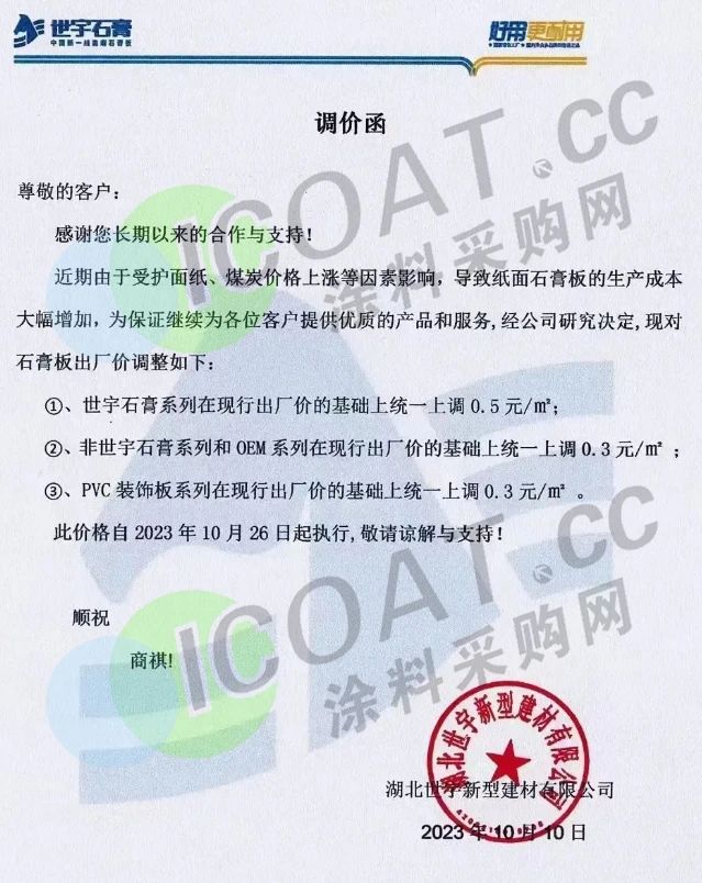 湖北世宇新型建材表示,10月26日起,世宇石膏在現行出廠價基礎上統一上調0.5元/㎡,非世宇石膏和OEM系列在現行出廠價的基礎上統一上調0.3元/㎡,PVC裝飾板系列在現行出廠價的基礎上統一上調0.3元/㎡。