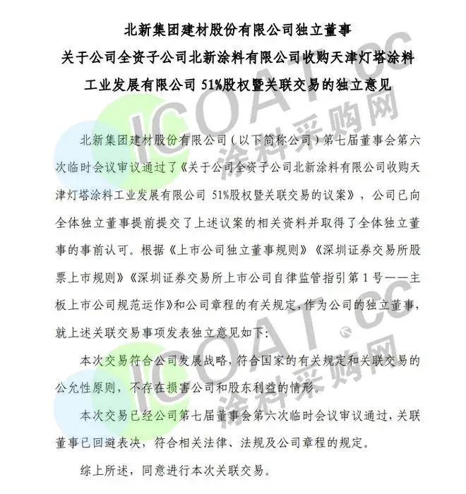 2023年4月28日,北新建材全資子公司北新涂料與中國(guó)建材集團(tuán)有限公司簽署了《關(guān)于天津燈塔涂料工業(yè)發(fā)展有限公司的股權(quán)轉(zhuǎn)讓協(xié)議》,擬以約1.3億元的價(jià)格收購天津燈塔涂料工業(yè)發(fā)展有限公司51%股權(quán)。