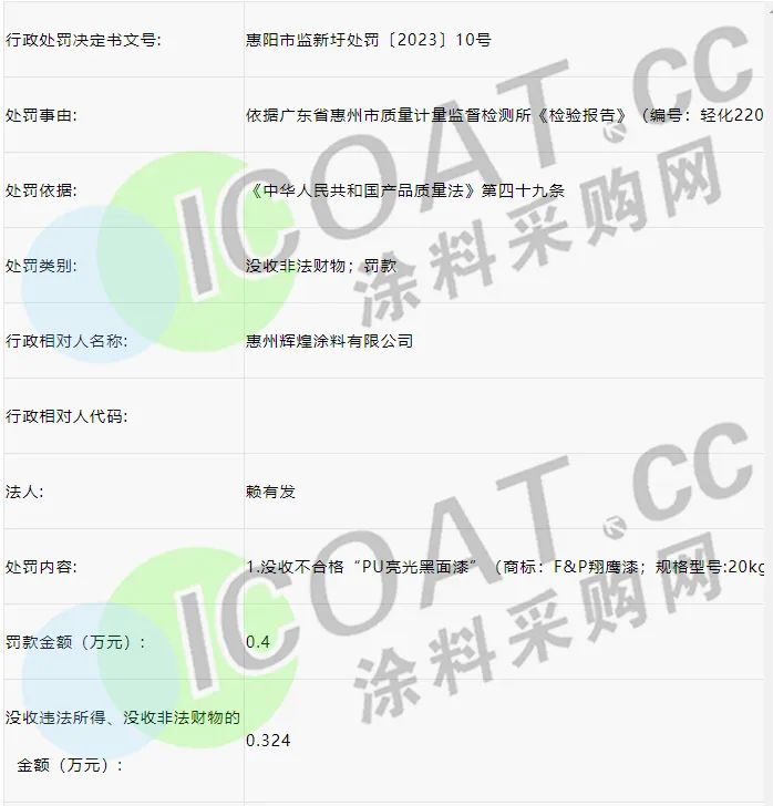 惠州輝煌涂料有限公司生產的“PU亮光黑面漆”“乙二醇醚及醚酯總和含量”項目不符合GB 18581-2020《木器涂料中有害物質限量》標準,判定為監督總體不合格。惠州市惠陽區市場監督管理局對其罰款人民幣4000元,并沒收不合格產品9桶(其中一桶已開封,已抽樣損耗2kg)。