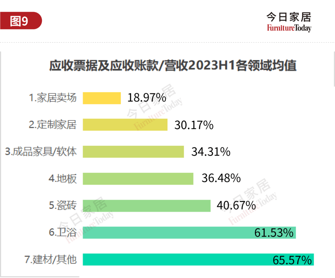 涂料采購網(wǎng)查閱了與房產(chǎn)相關(guān)的產(chǎn)業(yè)鏈企業(yè)2023年一季度財(cái)報(bào)發(fā)現(xiàn),應(yīng)收賬款及票據(jù)占營收比例普遍較高,其中家居賣場占18.97%,定制家居、成品家具/軟體、地板、瓷磚分別占比30.17%、34.31%、36.48%、40.67%,衛(wèi)浴、建材/其他分別占比61.53%、65.57%,更是超過了60%。這個(gè)數(shù)據(jù)越高,證明手中握著的資產(chǎn)中風(fēng)險(xiǎn)越大,對下游企業(yè)的議價(jià)權(quán)方面較弱,惡性循環(huán)之下,催收回來賬款的可能性就越低。