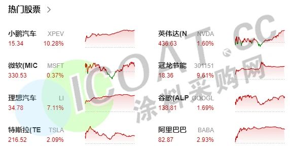 熱門(mén)中概股全線上漲,阿里巴巴漲2.93%,京東漲1.81%,拼多多漲3.98%,蔚來(lái)汽車(chē)漲6.59%,小鵬汽車(chē)漲10.28%,理想汽車(chē)漲7.11%,嗶哩嗶哩漲7.36%,百度漲3.75%,新東方漲3.65%,網(wǎng)易漲5.09%,騰訊音樂(lè)漲5.15%,愛(ài)奇藝漲5.27%。