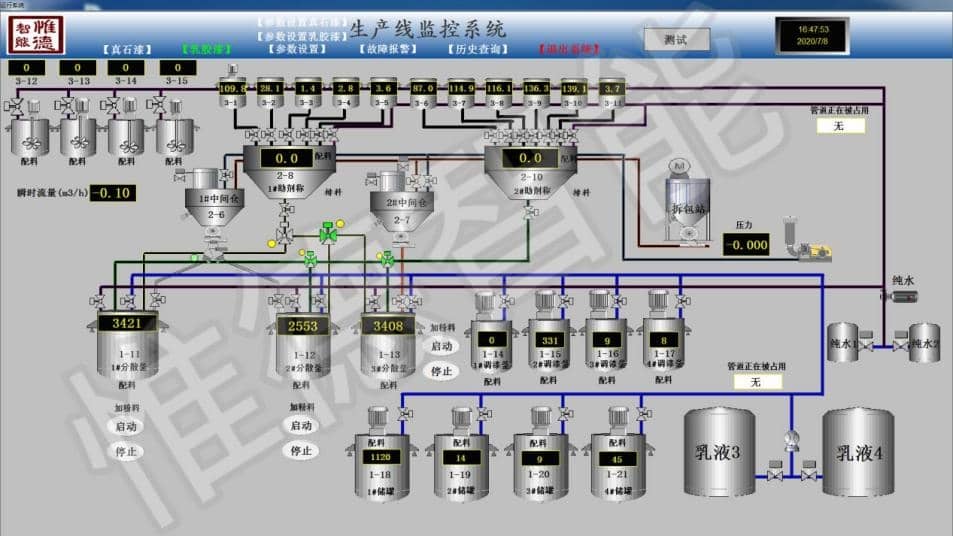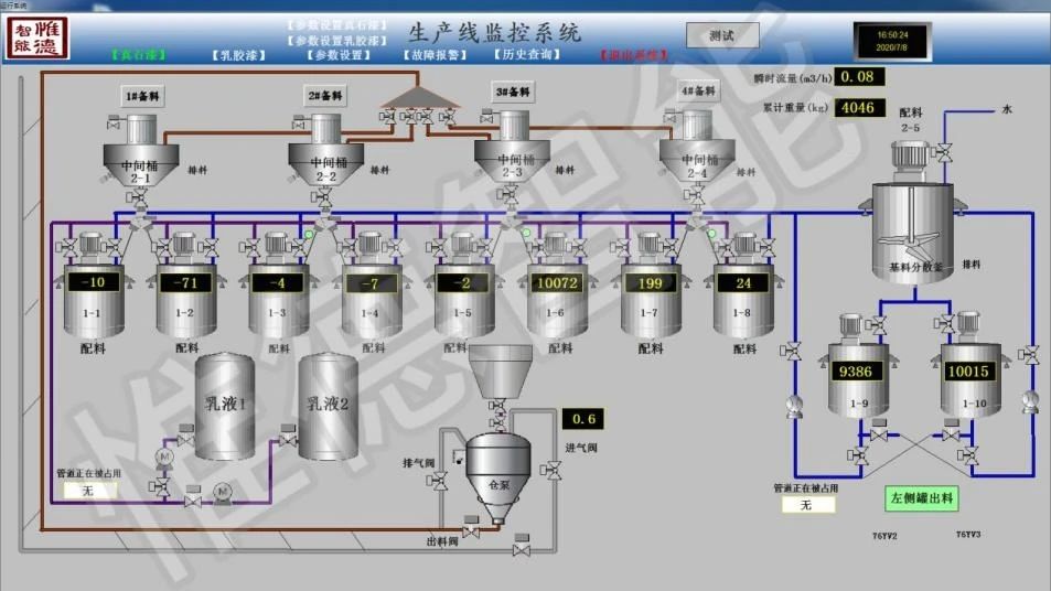 另一核心技術——惟德智能自主研發的整廠自動化控制系統WD-BCS,集現場或遠程操作系統、中控計算機ERP數據管理、QC監控、技術部配方管理、倉庫管理等多端口,多功能與一身,具備強大的管控優勢。是包括原料的存儲,輸送,稱重配料,物料混合及集中除塵在內的一體化解決方案,包含納微米級粉狀散料,高粘度液體等多種復雜物料的配料控制。