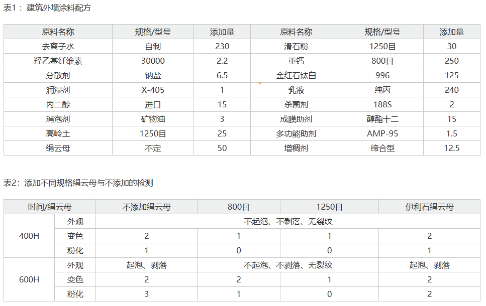 萬橋云母的產品還擁有紫外線屏蔽功能,提高涂膜的耐候性、延遲粉化變色。在建筑外墻涂料體系中,添加不同比例、不同規格的絹云母粉,進行人工耐老化實驗,實驗配方(見表1)及檢測結果(見表2)如下: