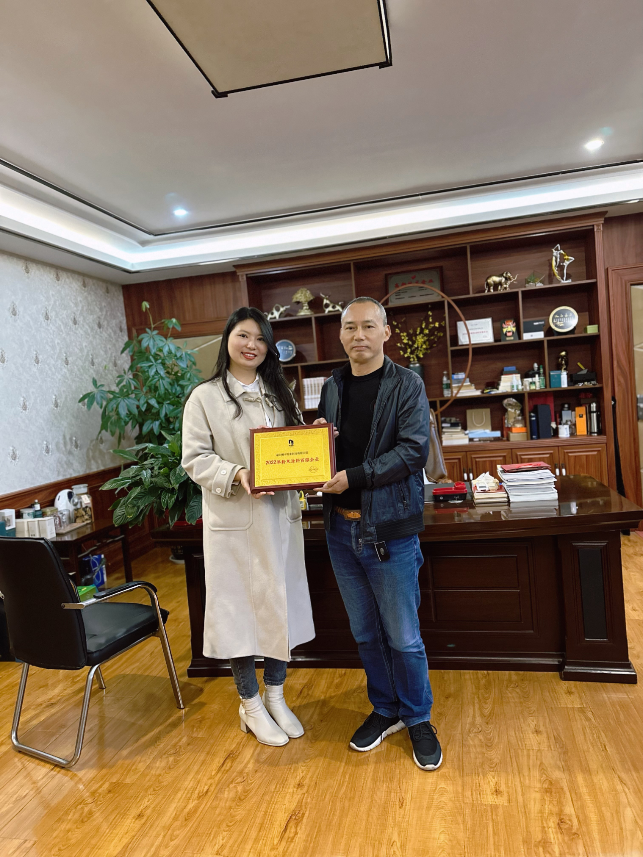 涂料采購網(wǎng)趙辰辰(左)為博宇粉末王總(右)頒發(fā)粉末百強獎牌