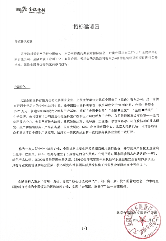 本項目名稱包裝袋供應商入圍,招標單位為北京金隅涂料有限責任公司,使用單位為北京金隅涂料有限責任公司、大廠金隅涂料有限責任公司。該項目已具備招標條件,現對包裝袋供應商入圍進行公開招標。