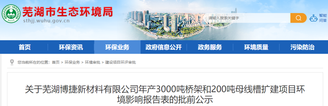 根據建設項目環境影響評價審批程序的有關規定,我局擬對蕪湖博捷新材料有限公司年產3000噸橋架和200噸母線槽擴建項目環境影響報告表作出審批意見。為保證審批意見的嚴肅性和公正性,現將該項目環境影響評價文件基本情況予以公示,公示期為本公示發布后五個工作日。如有意見,請于公示期內將書面意見反饋至市生態環境局行政審批科。