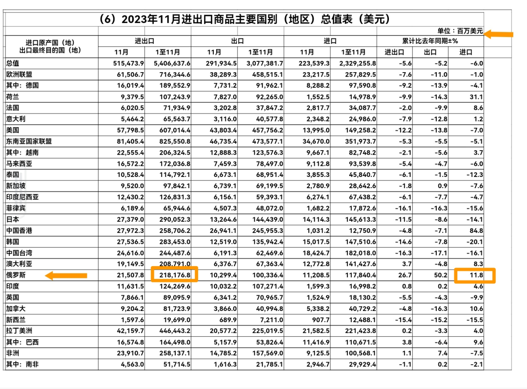 根據海關總署的數據,2023年1月至11月,中俄兩國貿易總額達到了2181.76億美元,歷史上首次突破2000億美元。中國對俄出口1003.36億美元,同比增長50.2%;中國自俄進口1178.4億美元,同比增長11.8%。