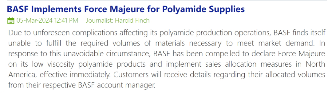 巴斯夫指出,由于市場條件的多變性,銷售分配和交貨計劃可能會發生變化,正在積極尋求一切合理的途徑,以確定緩解戰略,應對供應鏈中遇到的挑戰。