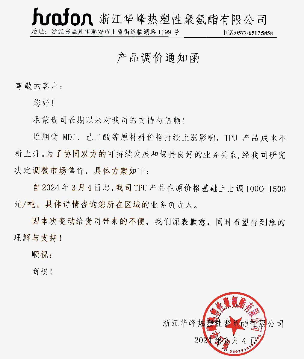 浙江華峰:旗下TPU產品在原價格上調1000-1500元/噸。