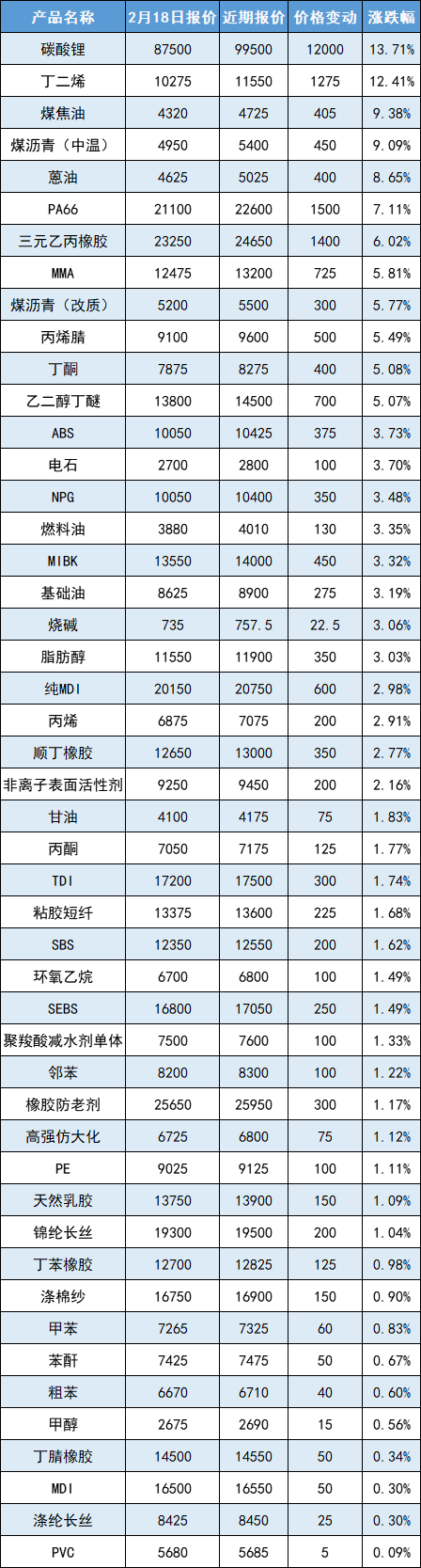 在此影響下,化工市場掀起新一輪漲價潮,自春節后至今,40余種化工品價格上漲,噸價最高上漲12000元/噸,漲幅超過13%。