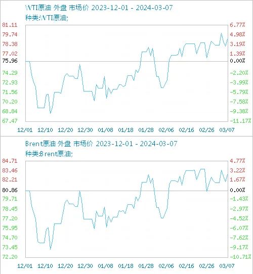 國際油價進入2024年之后連續兩個月收漲,截至3月7日收盤,紐約商品交易所輕質原油期貨價格上漲至每桶80.41美元,倫敦布倫特原油期貨價格也上漲至每桶83.83美元。