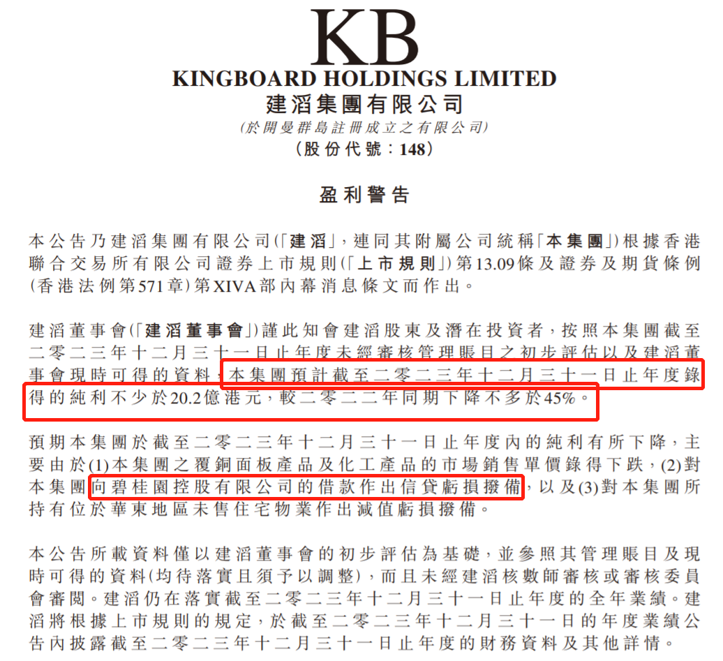 值得注意的是,此次對碧桂園“發(fā)難”的建滔集團,是一家以印刷線路板、化工產(chǎn)品等為主要業(yè)務(wù)的企業(yè)。不僅持有富力的股權(quán),還曾多次購入富力、碧桂園的公開票據(jù),且認購比例并不低。隨著房地產(chǎn)行業(yè)的下行,建滔的業(yè)績受到影響,預(yù)計2023年凈利潤同比下降多于45%。踩坑房地產(chǎn)后的“化工大王”此次決定高調(diào)行動,或許是迫不得已的一種自救。