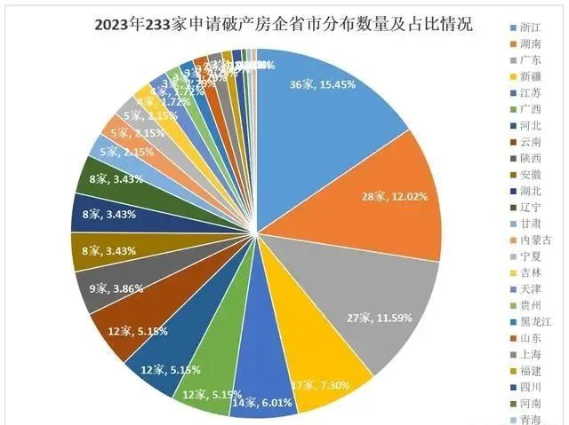 樓市陷入“買不起也賣不掉”的怪圈,既收不回成本也還不起債務(wù),資金鏈斷裂之下唯有破產(chǎn)一條路。2023年全國約有233家房企發(fā)布了破產(chǎn)文書,廣東、新疆、浙江、江蘇、湖南五省房企破產(chǎn)數(shù)量占總數(shù)50%。
