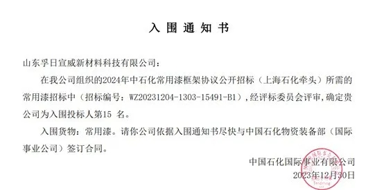 石化能源涂料領域,孚日宣威在2023年中石化常用漆框架協議公開招標中首度入圍,2023年底再次入圍中國石化2024年度供應商,實現了名次的大幅提升,成為入圍投標人第15名,2024年孚日宣威有望承接更多中石化中大型項目;