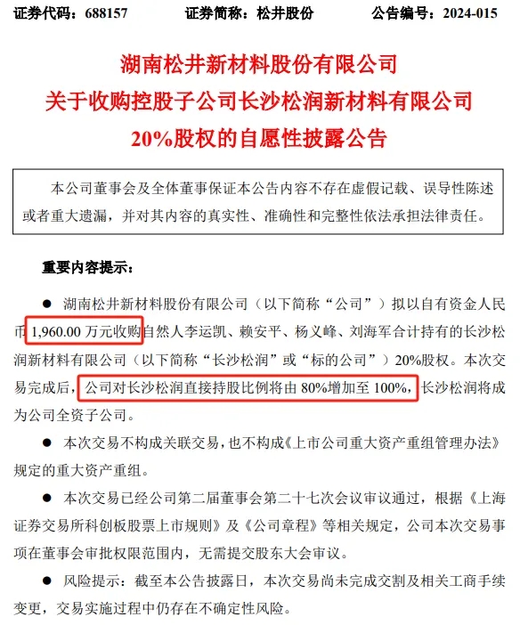 長沙松潤是蔚來、理想、吉利、廣汽、小鵬、一汽紅旗等眾多國內外知名整車及汽車零部件等企業的供應商,主要為汽車企業提供涂料等多類別系統化解決方案的新型功能涂層材料。公告中提及,標的公司(長沙松潤)近2年的凈資產和凈利潤均為負值,其中2023年年底凈資產為-133.96萬元,2023年全年凈利潤-2.98萬元。
