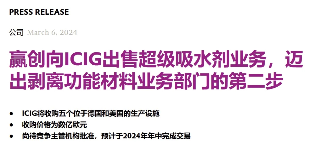 贏創與國際化工投資者集團(ICIG)簽署協議,將出售其超級吸水劑業務。收購價格達數億歐元,預計將于2024年年中完成交易。