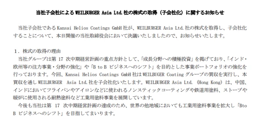 威堡亞洲有限公司的工業涂料業務將被關西涂料歐洲子公司Helios收購,涵蓋威堡在歐洲、美洲、亞洲等地的生產基地。收購價格38.86億日元,收購完成后,關西涂料還將持有威堡亞洲的子公司威堡天津和威堡投資的股份。