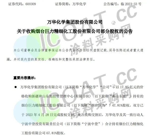 新疆和山東旭投資管理中心(有限合伙)持有的煙臺巨力精細化工股份有限公司47.81%股權,被萬華化學集團股份有限公司收購。