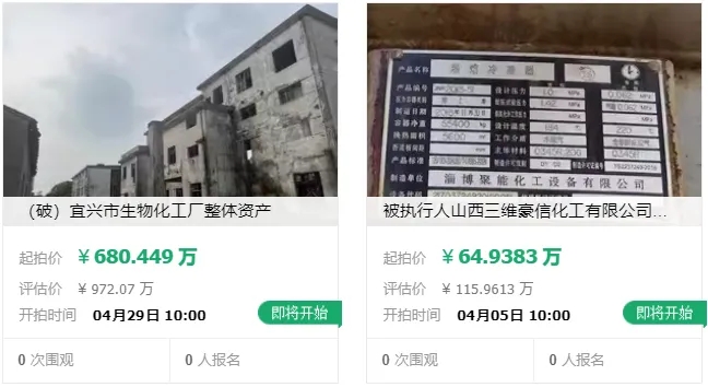 在某法拍網站上,部分涂料、化工企業由于破產倒閉,被進行資產、股權的拍賣,最高超過9億元,包括化工企業名下的土地使用權及其地上在建工程和機器設備,而低至千元以下的氣動泵、燈具等多個日用品類目也頻頻出現。