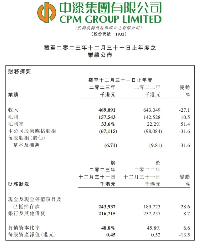 近日,中漆集團發布截至2023年12月31日止年度業績,該集團取得收入4.69億港元,同比減少27.1%;公司股東應占虧損6711.5萬港元,同比減少31.6%;每股虧損6.71港仙。