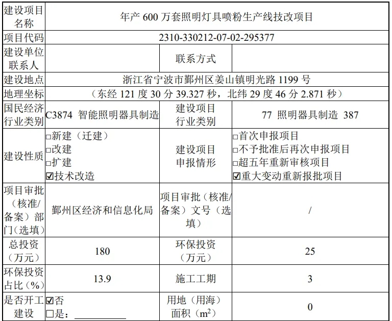 2020年3月,企業(yè)委托編制了《年處理500萬套燈具殼體生產(chǎn)線技改項(xiàng)目環(huán)評(píng)報(bào)告表》并于次月取得了該項(xiàng)目的環(huán)評(píng)批復(fù)(鄞環(huán)規(guī)備〔2020〕7號(hào)),該項(xiàng)目不新增產(chǎn)品產(chǎn)量,主要對二期項(xiàng)目中的500萬套LED產(chǎn)品的殼體進(jìn)行噴粉加工。企業(yè)在項(xiàng)目的實(shí)施過程中,考慮到公司電耗和企業(yè)發(fā)展需要,擬將噴粉固化工序的電加熱改為天然氣燃燒供熱,同時(shí)新增LED燈具殼體噴粉量100萬套/年。