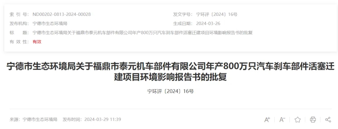 你公司報送的《福鼎市泰元機車部件有限公司年產800萬只汽車剎車部件活塞遷建項目環境影響報告書》(項目代碼:2020-350982-36-03-066495,以下簡稱《報告書》)和要求審批的申請表收悉。根據報告書結論、技術審查會專家組審查意見,現對報告書批復如下: