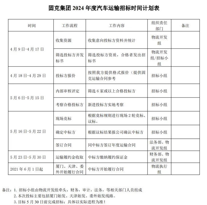 3. 合格參標(biāo)方將進(jìn)入投標(biāo)技術(shù)標(biāo)書(shū)準(zhǔn)備階段(提供合同版本、發(fā)貨量、始發(fā)地參考、報(bào)價(jià)表等),時(shí)間為4月18日—4月29日,若有變動(dòng),以線(xiàn)下通知為準(zhǔn)。