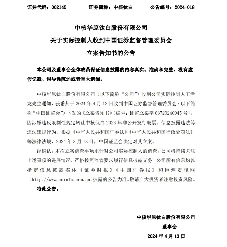 近日,國內(nèi)鈦白粉龍頭企業(yè)中核鈦白發(fā)布公告稱,收到公司實際控制人王澤龍先生通知,獲悉其于2024年4月12日收到證監(jiān)會下發(fā)的《立案告知書》,因涉嫌違反限制性規(guī)定轉(zhuǎn)讓中核鈦白 2023年非公開發(fā)行股票、信息披露違法等違法違規(guī)行為,根據(jù)《中華人民共和國證券法》《中華人民共和國行政處罰法》等法律法規(guī),2024年3月13日,中國證監(jiān)會決定對其立案。