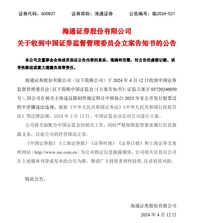 公告亦稱,同日,公司全資孫公司中信中證資本管理有限公司收到證監(jiān)會《立案告知書》,內(nèi)容為:“因你公司在相關(guān)主體違反限制性規(guī)定轉(zhuǎn)讓中核鈦白2023年非公開發(fā)行股票過程中涉嫌違法違規(guī),根據(jù)《中華人民共和國證券法》《中華人民共和國行政處罰法》等法律法規(guī),2024年3月13日,我會決定對你單位立案。”對于此次被立案一事,海通證券和中信證券均在公告中表示,將積極配合證監(jiān)會的相關(guān)工作,并嚴(yán)格按照監(jiān)管要求履行信息披露義務(wù)。同時,它們也強(qiáng)調(diào)目前公司的經(jīng)營情況正常。當(dāng)晚,中信證券對媒體表示,將認(rèn)真學(xué)習(xí)貫徹資本市場新“國九條”,堅持以投資者為本,依法合規(guī)經(jīng)營,發(fā)揮好直接融資“服務(wù)商”、資本市場“看門人”、社會財富“管理者”的功能,保護(hù)投資者合法權(quán)益,進(jìn)一步提升合規(guī)水平、專業(yè)服務(wù)能力和核心競爭力,更好服務(wù)資本市場高質(zhì)量發(fā)展。