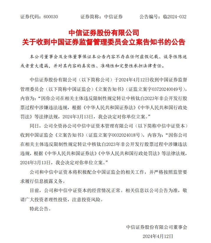 中信證券也公告,于2024年4月12日收到證監(jiān)會《立案告知書》,內(nèi)容為:“因你公司在相關(guān)主體違反限制性規(guī)定轉(zhuǎn)讓中核鈦白2023年非公開發(fā)行股票過程中涉嫌違法違規(guī),根據(jù)《中華人民共和國證券法》《中華人民共和國行政處罰法》等法律法規(guī),2024年3月13日,我會決定對你單位立案。”