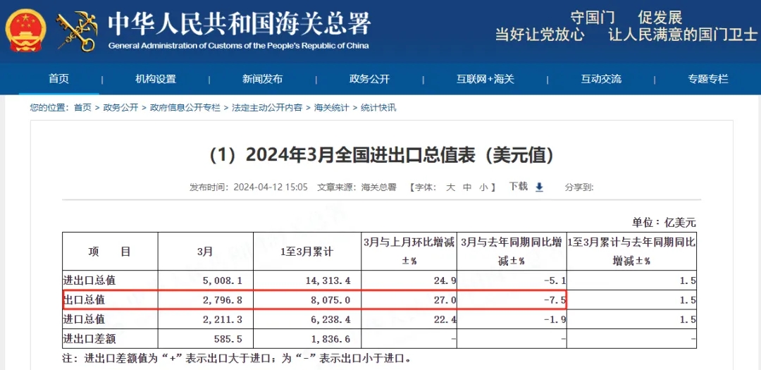 近日,海關總署發布3月出口數據。以美元計,3月中國進出口總值5008.1億美元,同比下降5.1%。其中出口2796.8億美元,同比減少7.5%。機構分析,這是由于美國、歐盟市場拖累中國外貿增速,3月美國和東盟分別拖累進出口下降1.7%、1.6%。