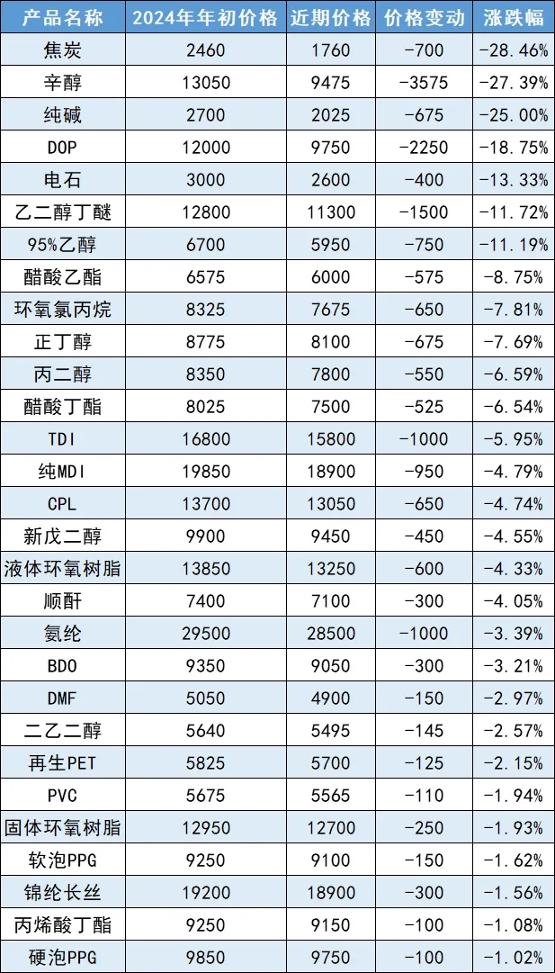 年初以來部分化工品價格變動表