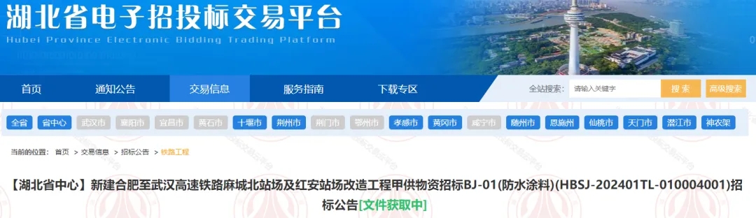 新建合肥至武漢高速鐵路麻城北站場及紅安站場改造工程甲供物資招標BJ-01(防水涂料)(HBSJ-202401TL-010004001)招標公告
