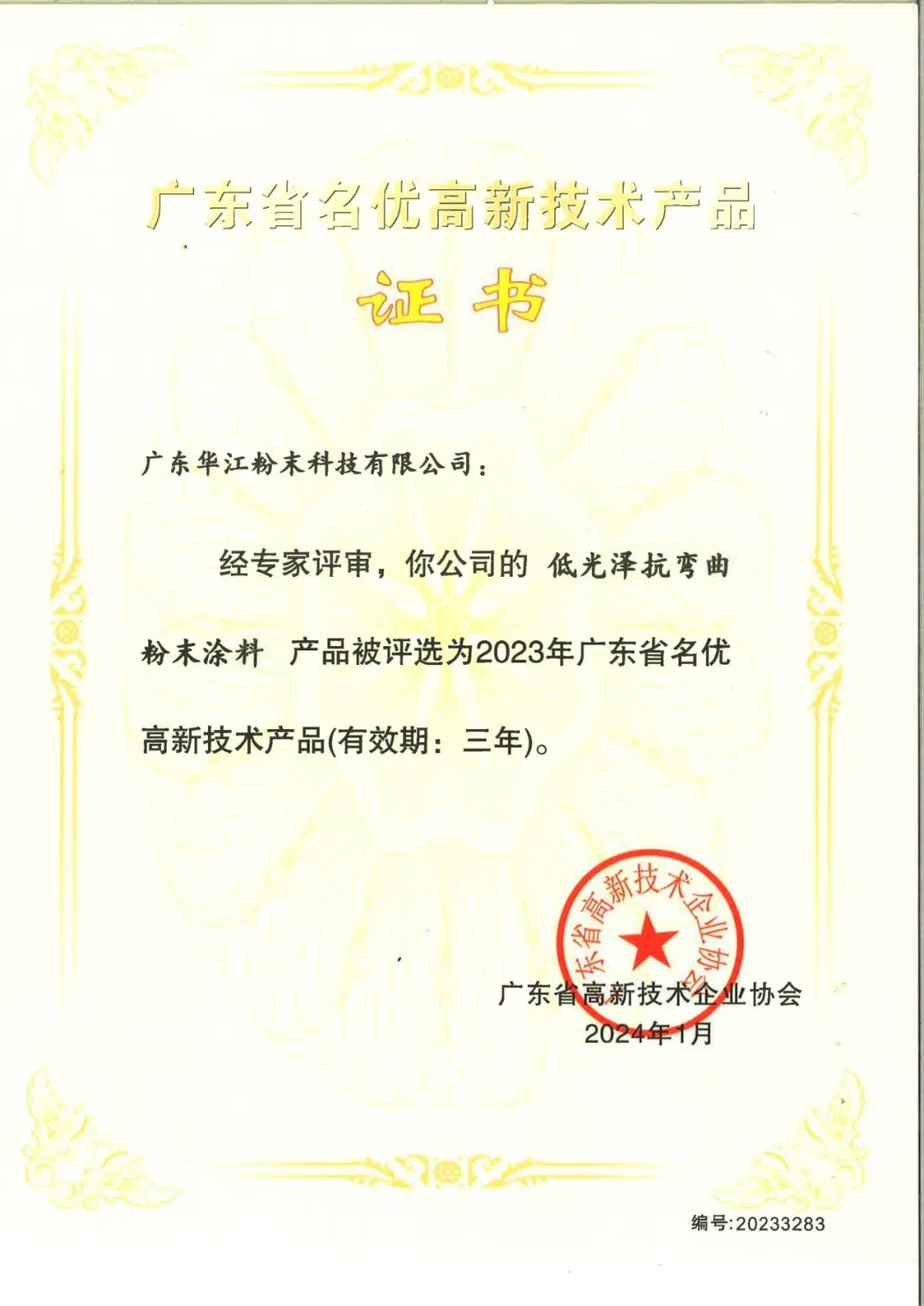 華江粉末2023年新申請發明專利3項。新獲得授權發明專利3項、實用新型專利2項。截止2023年底華江工廠累計擁有授權發明專利26項、授權實用新型專利4項,主導及參與制定粉末涂料涂裝相關標準項四十多項,發表科技論文99篇。2023年,廣東華江粉末科技有限公司的“低光澤抗彎曲粉末涂料”和“高效耐水粉末涂料”兩項創新產品,入選為廣東省名優高新技術產品。
