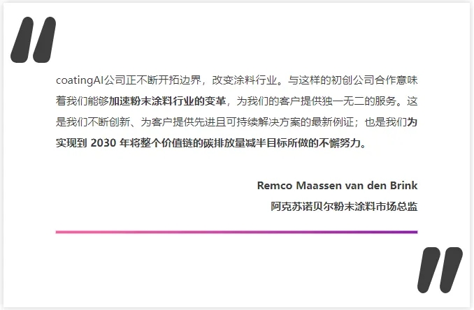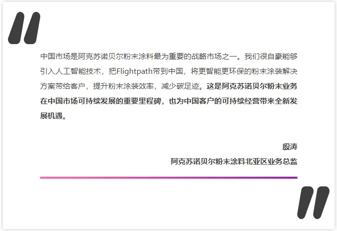 近日,阿克蘇諾貝爾粉末涂料業(yè)務(wù)部與coatingAI公司合作開(kāi)發(fā)的革命性軟件Flightpath登陸中國(guó)市場(chǎng)。這項(xiàng)業(yè)內(nèi)首創(chuàng)的軟件基于人工智能技術(shù),能夠助力客戶改進(jìn)粉末涂料的應(yīng)用流程并減少碳足跡,讓粉末涂裝更綠色高效。