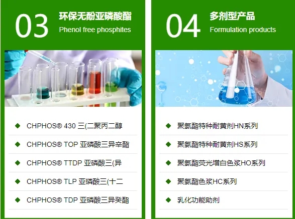 在TPU抗老化解決方案方面,業界獨有的無酚耐水解亞磷酸酯抗氧劑CHPHOS®8503,能夠耐高溫抗氧化、耐水解、耐工業廢氣黃變更適合用于TPU發泡、薄膜等應用。
