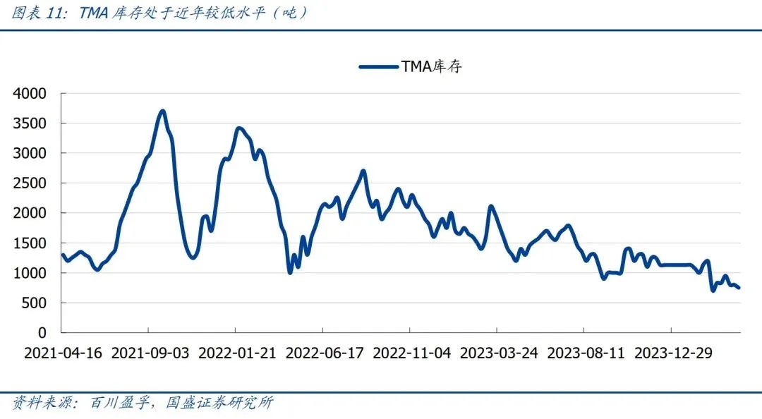 目前,TMA全球總產能約25萬噸,主要有5家生產企業,其中美國英力士7萬噸,意大利波林3萬噸,正丹股份8.5萬噸,百川股份4萬噸,泰達新材3萬噸,屬于壟斷性格局。消息稱“行業第二”的美國英力士裝置宣布結束TMA生產,相關生產設備已拆除,意味著全球供應將出現明顯缺口。另外,國內工廠部分裝置停車或低負荷運行,導致TMA現貨流動整體偏緊。