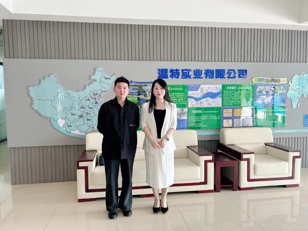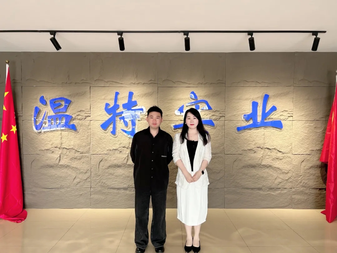 涂料采購網(wǎng)江雪(右)到訪溫特實業(yè)并與總經(jīng)理周士盟(左)合影
