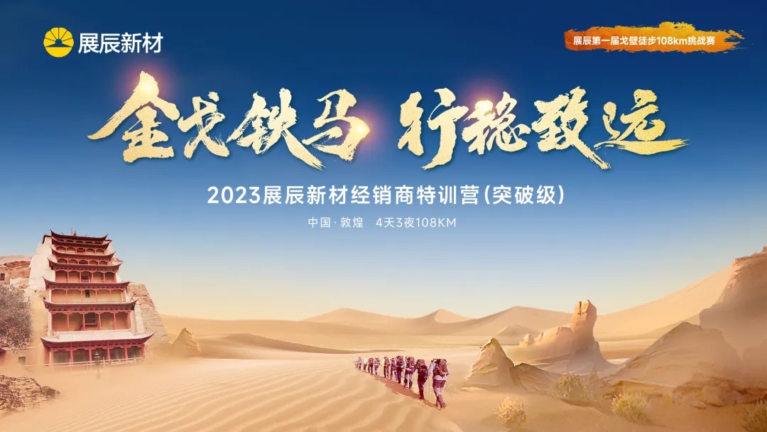 9月11日,天空湛藍如洗,秋高氣爽,以“金戈鐵馬,行穩致遠”為主題的2023展辰新材經銷商特訓營(突破級)在絲路古城敦煌順利開營,本次特訓營活動,旨在進一步提升經銷商伙伴的專業知識,交流經驗心得,強化團隊凝聚力,更好地把握當下市場機會。