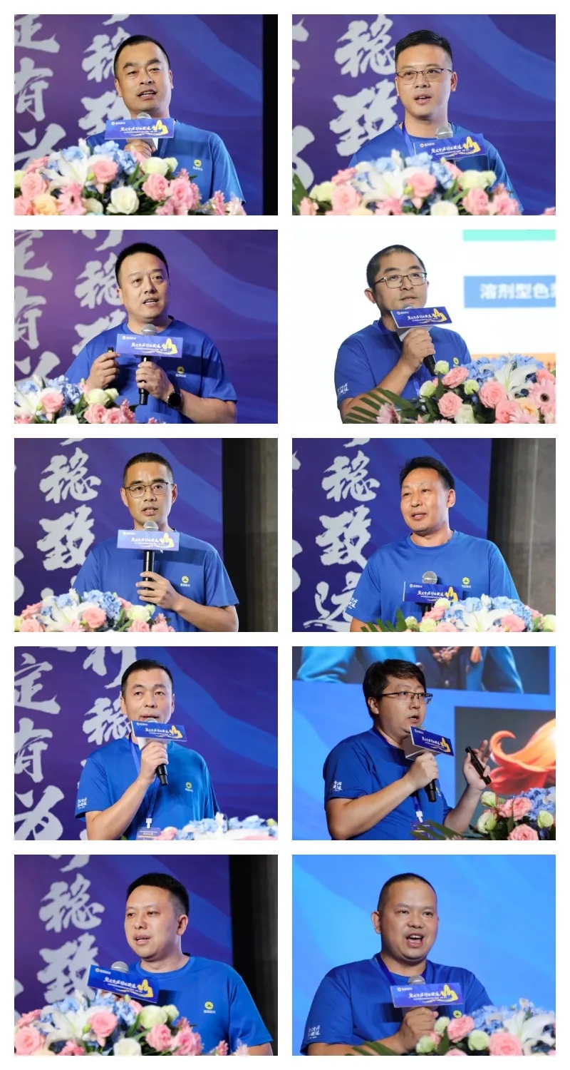 在專題分享部分,濮陽公司副總經理王廣躍先生、福州公司副總經理魏洋先生、青島公司總經理助理李峰先生、技術管理中心總經理助理王向科先生、產品管理中心總經理助理劉寶山先生、產品培訓部總監羅毅先生、品牌部經理王鵬先生、機械涂裝部經理夏全輝先生以及來自濟南銷售團隊的陳正良先生和來自成都銷售團隊的張彪先生也分別從不同的板塊和視角為大家帶來關于產品工藝、技術創新、應用服務、渠道拓展、案例分析、培訓賦能、品牌建設等豐富的干貨分享,提供了多樣化的觀點和視角,為大家開闊思路,增強信心。