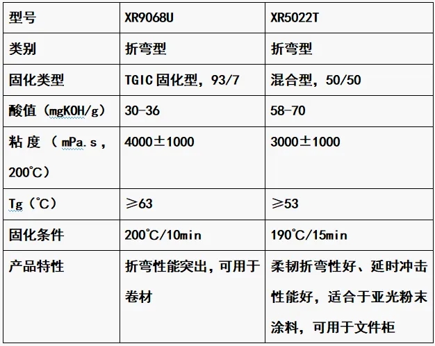 XR9068U折彎型樹脂是一種反應(yīng)活性較快的樹脂,粘度適中,Tg較高,分子鏈比較柔性,具有優(yōu)良的耐候、良好的機械性能以及極佳的柔韌性,已規(guī)模用于卷材涂料;XR5022T延時折彎型樹脂的反應(yīng)活性適中,粘度適中,分子鏈比較柔性,分子量比較大,具有良好的消光效果。該產(chǎn)品柔韌折彎性好、延時沖擊性能好,適合于亞光粉末涂料,板面細(xì)膩度好。