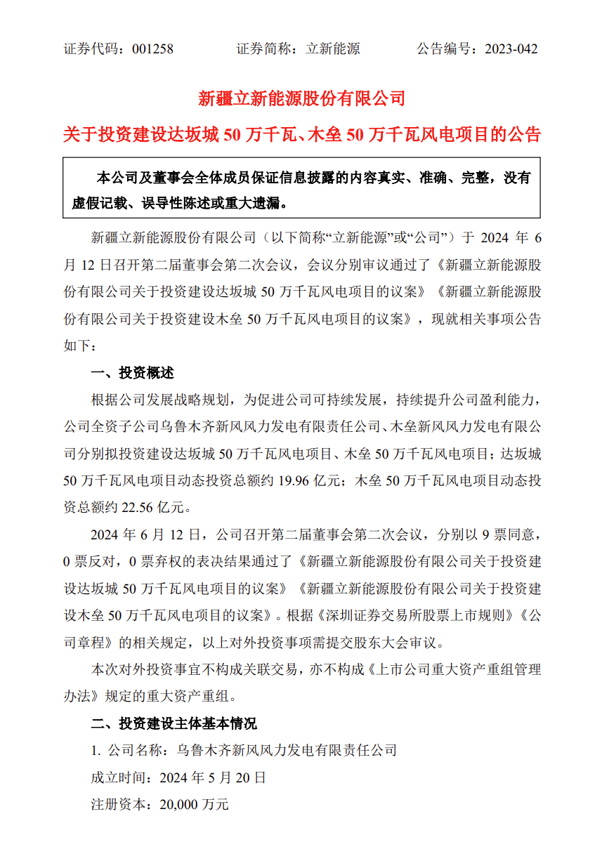 公告顯示,立新能源達坂城50萬千瓦風電項目,主要建設內容包含儲能、220kV配套送出工程及間隔、220kV升壓匯集站,由立新能源全資子公司烏魯木齊新風風力發電有限責任公司建設,建設工期6個月,計劃竣工時間為2024年12月31日。新疆能源立新木壘50萬千瓦風電項目,主要建設內容包含110kV配套送出工程、間隔擴建及110kV升壓站,由立新能源全資子公司木壘新風風力發電有限公司建設,建設工期6個月,計劃竣工時間為2024年12月31日。據了解,兩項目投資額共計42.52億元,建設資金20%來源于公司自有資金,80%為銀行貸款。對此次投資,立新能源表示,兩項目擬建場址風能資源較為豐富,不僅可利用當地的風能資源,符合國家的能源發展戰略,又可對緩解當地電力供需矛盾起到一定作用,在減少溫室效應氣體排放等方面產生積極的推動作用,同時進一步優化公司可再生能源業務結構,壯大產業規模,做強做優可再生能源業務。