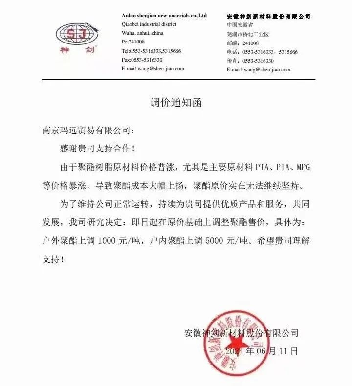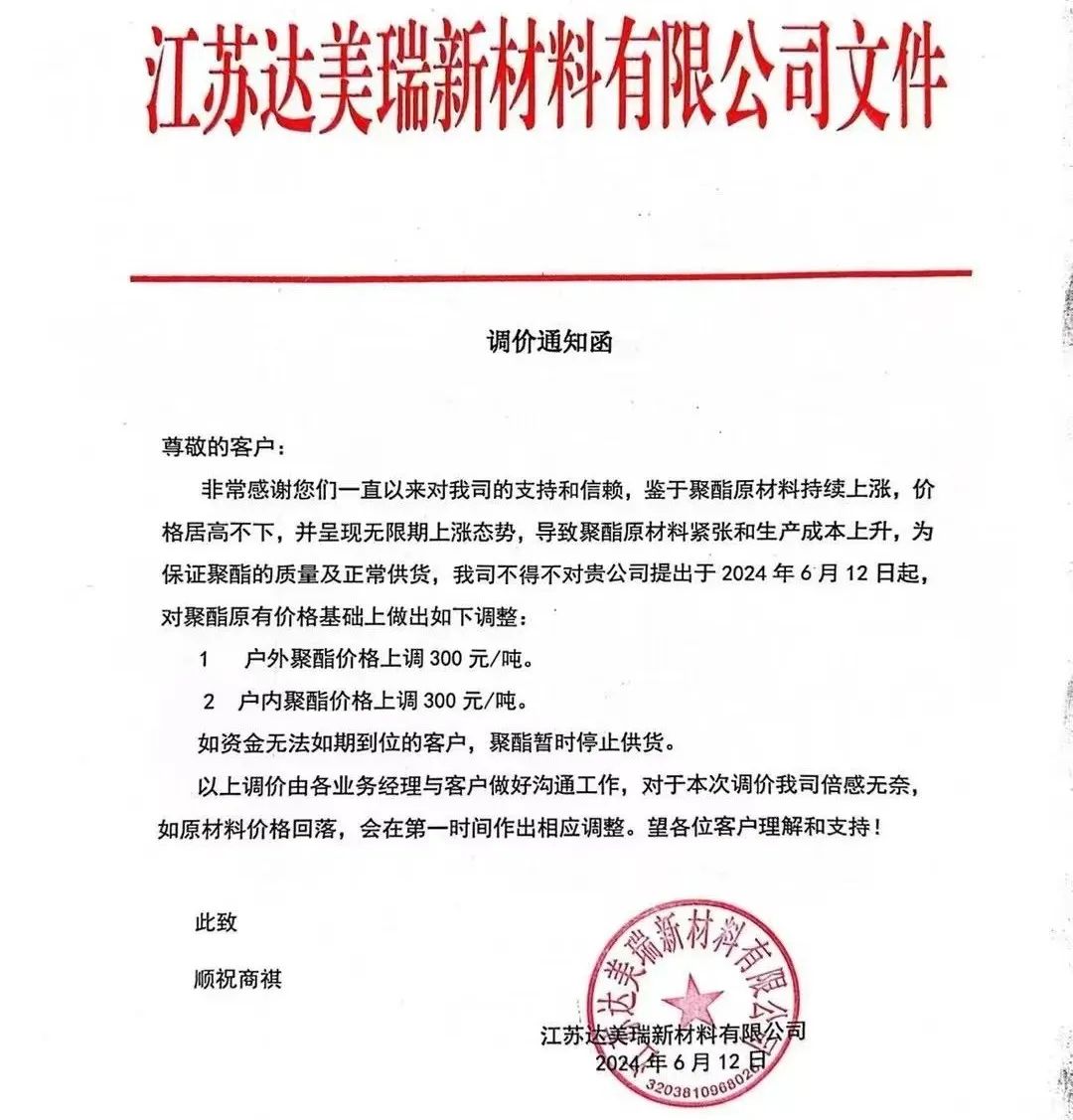 江蘇達美瑞新材料:6月12日起,戶外聚酯價格上調300元/噸,戶內聚酯價格上調300元/噸。如資金無法如期到位的客戶,聚酯暫時停止供貨。
