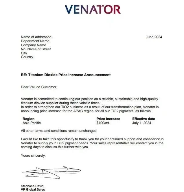 泛能拓Venator:7月1日起,亞太地區TiO2漲價100美元/噸。