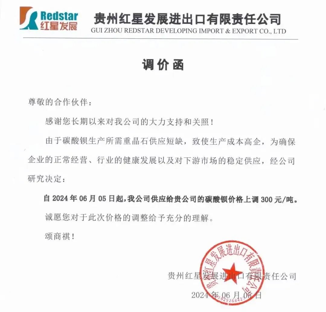 貴州紅星發展進出口:6月5日起,碳酸鋇價格上調300元/噸。