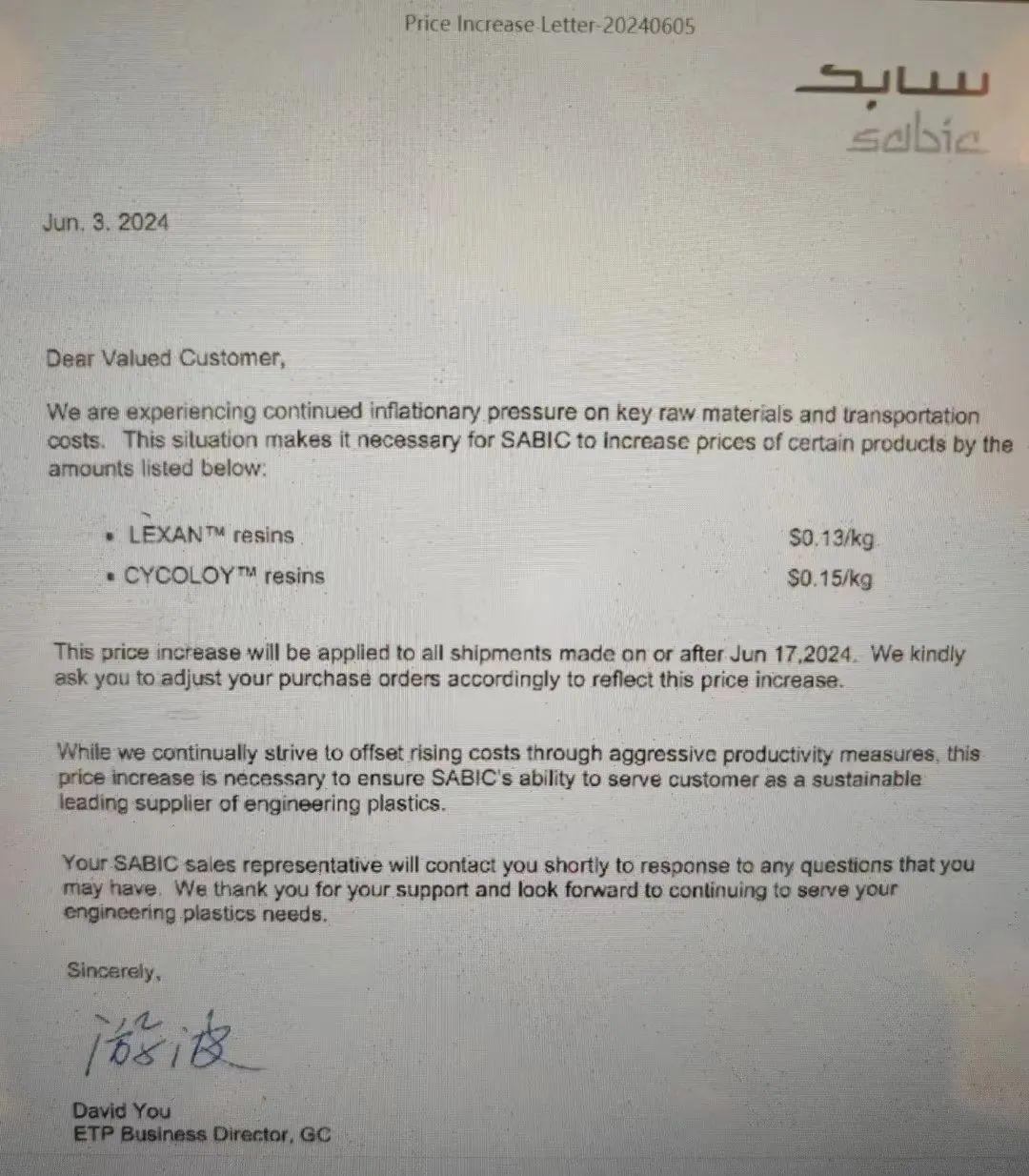 SABIC:LEXAN™(PC)樹脂上漲0.13美元/千克,CYCOLOY™(ABS)樹脂上漲0.15美元/千克。