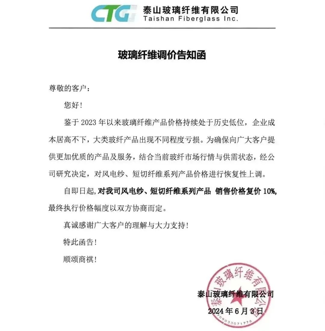 泰山玻纖:即日起,對風電紗、短切紗系列產品銷售價格復價10%。