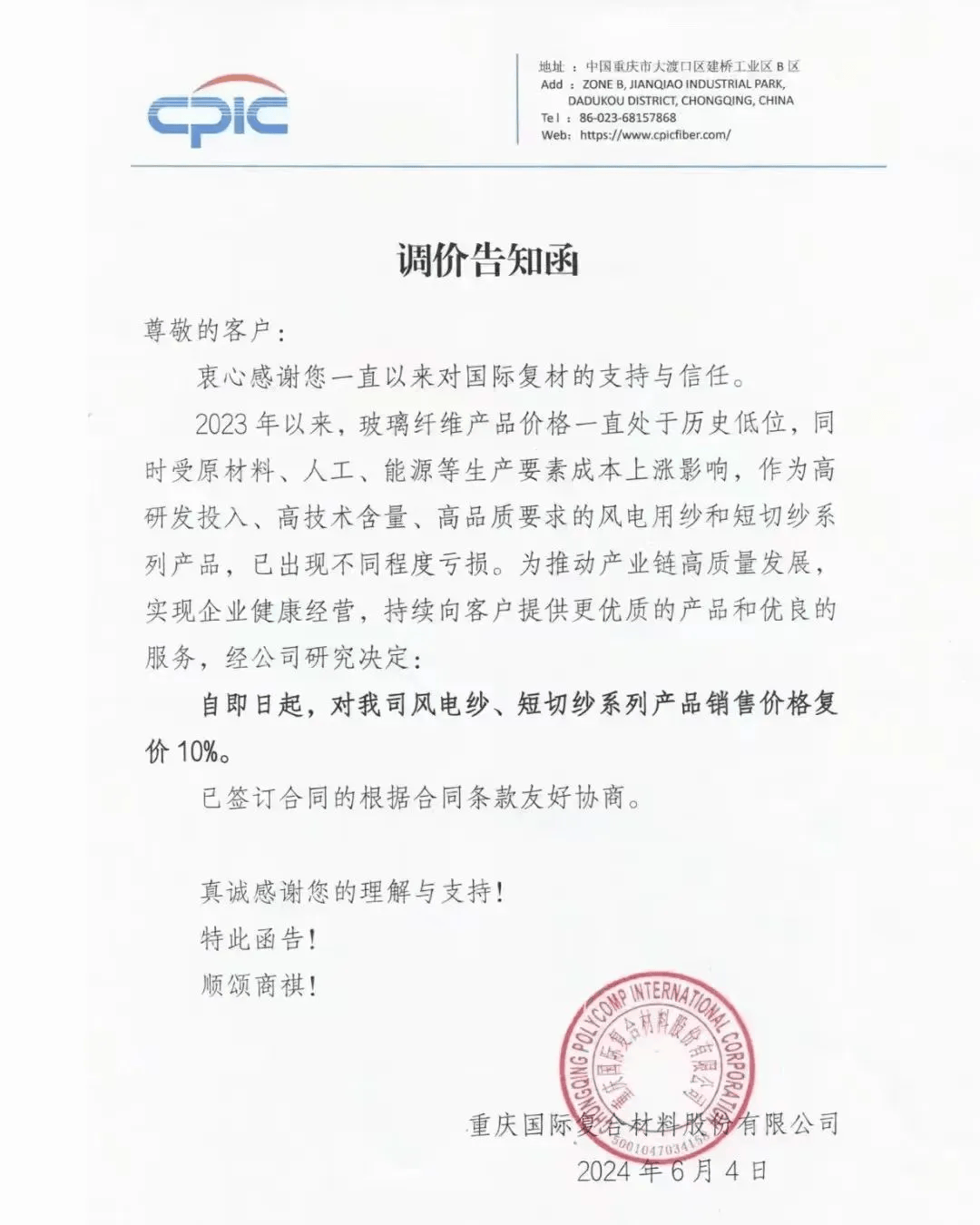 國際復材:即日起,對風電紗、短切紗系列產品銷售價格復價10%。