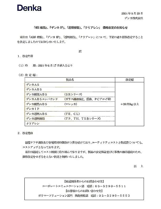 Denka :AS、ABS等產品6月1日正式漲價,上漲20日元/kg。